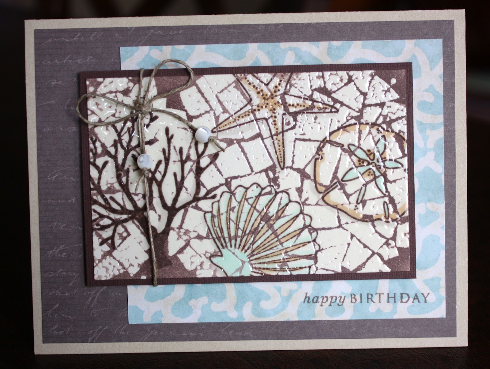 I really love this technique! I have used this AMuse shell set to make almost the same card, but I just really love this technique with anything beachy. I made this Birthday card for my Brother in Law. I hope that you like it!